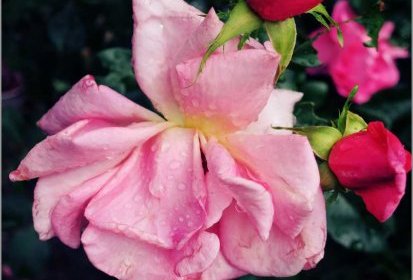Au jardinDes fleurs ployant sous le poids de l’eau de pluie...