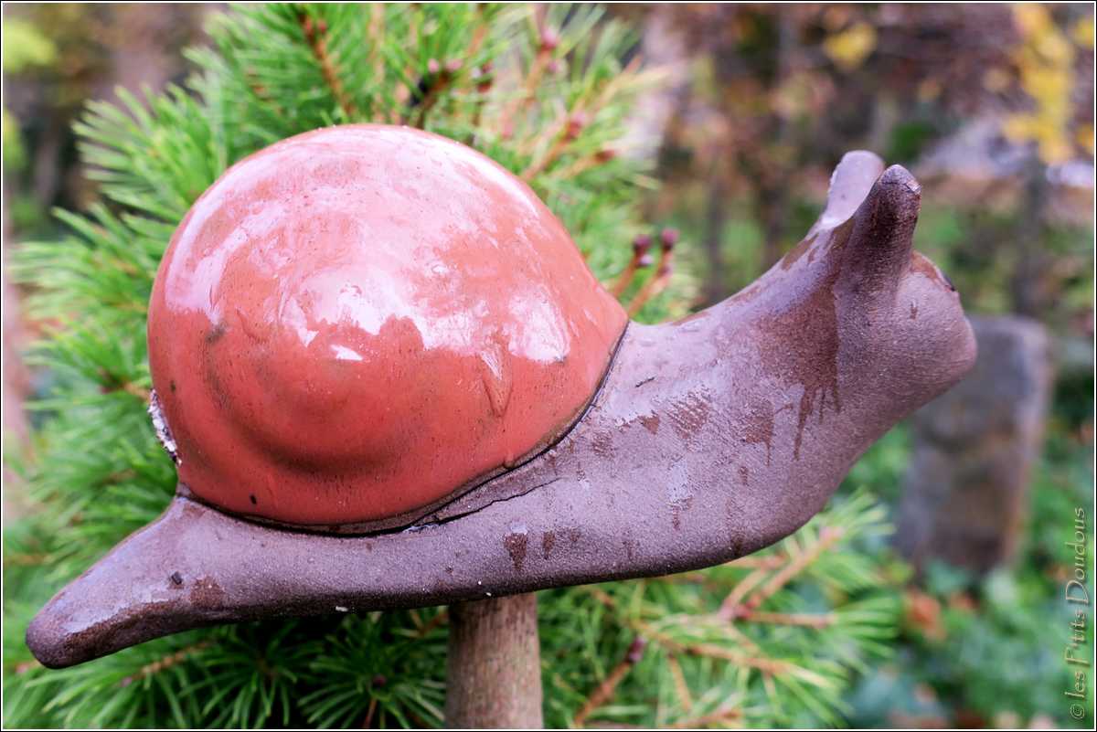 Imperturbable, l’escargot laisse glisser sur sa coquille les gouttes de la dernière pluie.