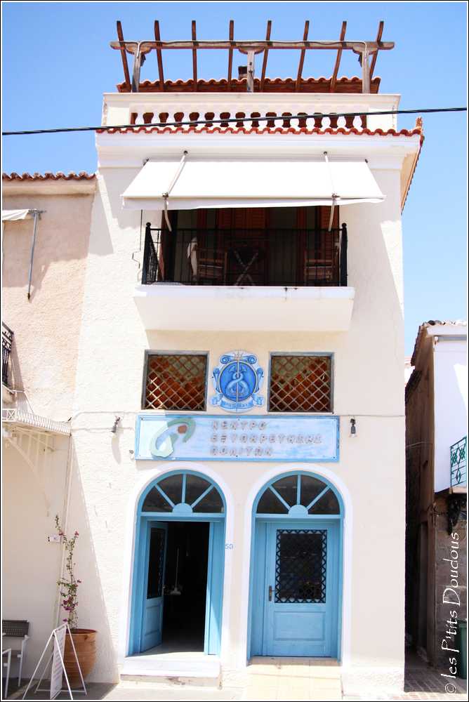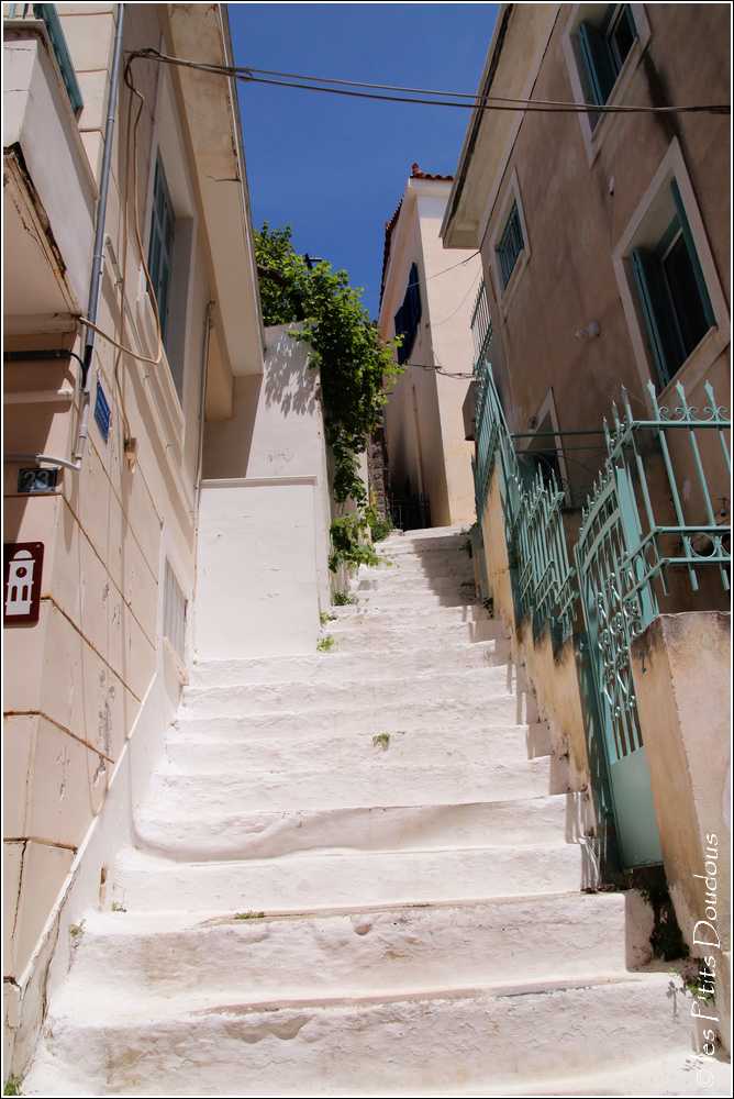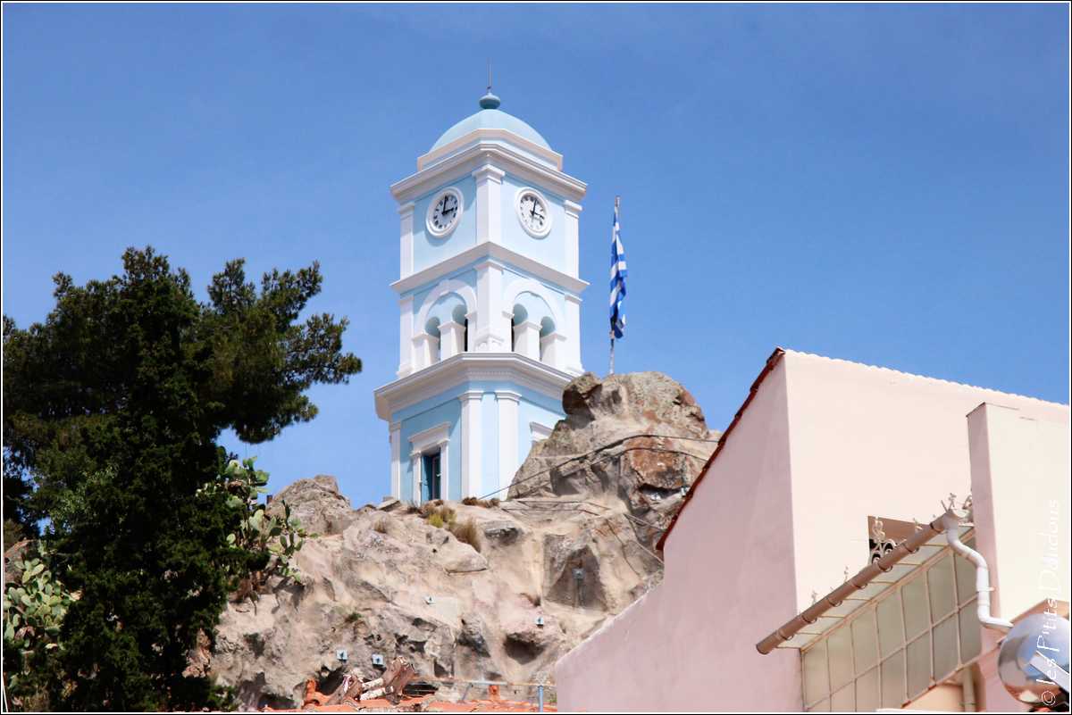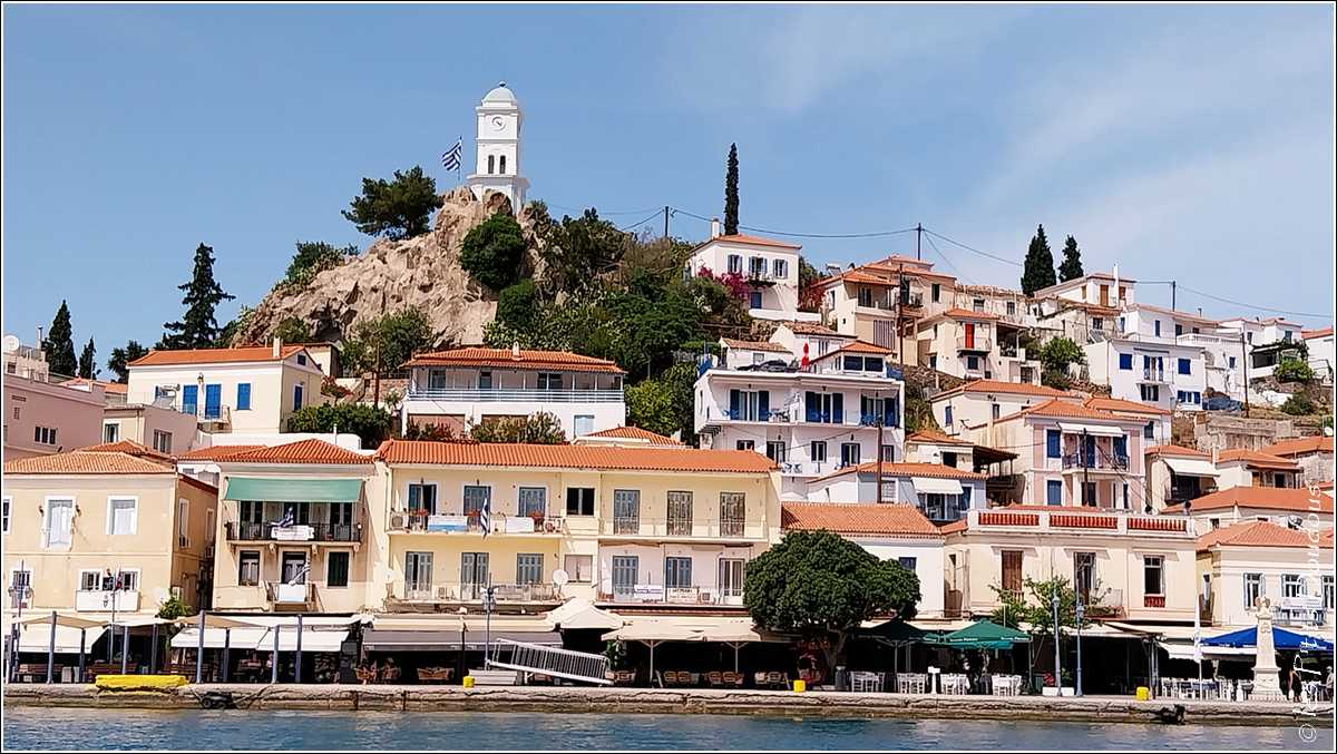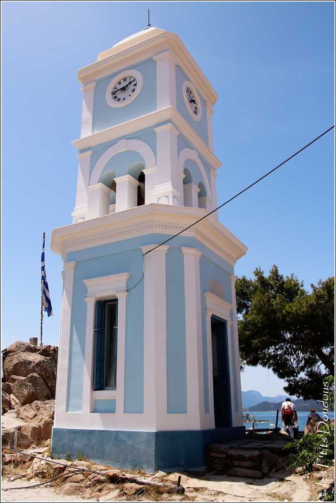 La ville de Poros est dominée par une Tour Horloge blanche et bleue construite sur la colline de Sfaira, que l’on atteint en serpentant dans les ruelles et grimpant les escaliers entre les maisons pour profiter de la vue magnifique sur la ville et la baie.
