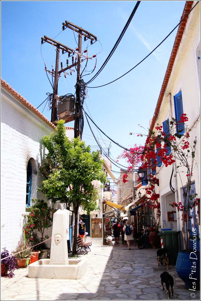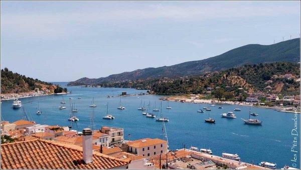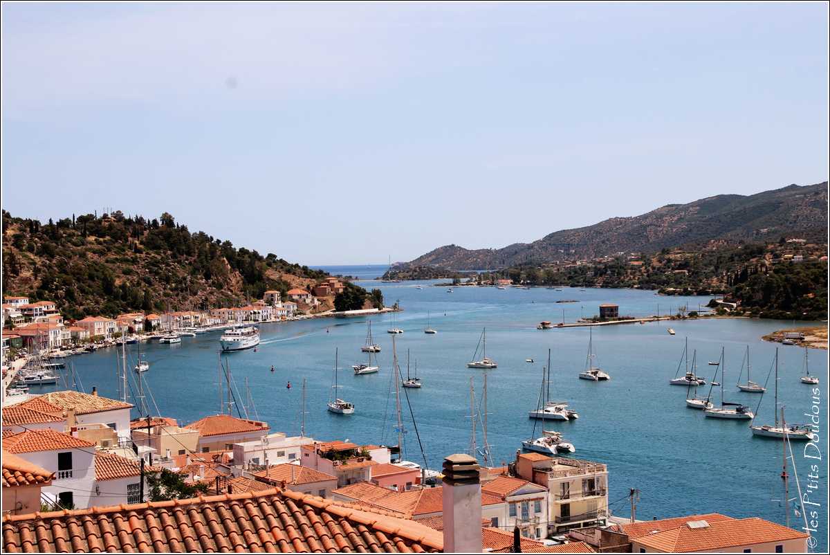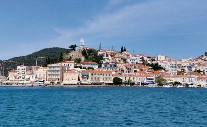 Située à quelques centaines de mètres du continent, l’île de Poros, avec ses collines vertes et ses maisons blanches couvertes de tuiles orange, possède un joli port où se croisent barques de pêcheurs, voiliers tirant des bords entre les îles, ferries assurant la liaison avec Athènes et yachts en bois.