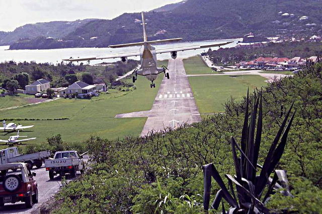 Ainsi l’atterrissage à Saint Barth est toujours très spectaculaire. La piste se déroulant en pente vers la mer, l’avion, après avoir passé entre deux mornes [1] et survolé une route en piquant, se cabre juste avant de toucher la piste…