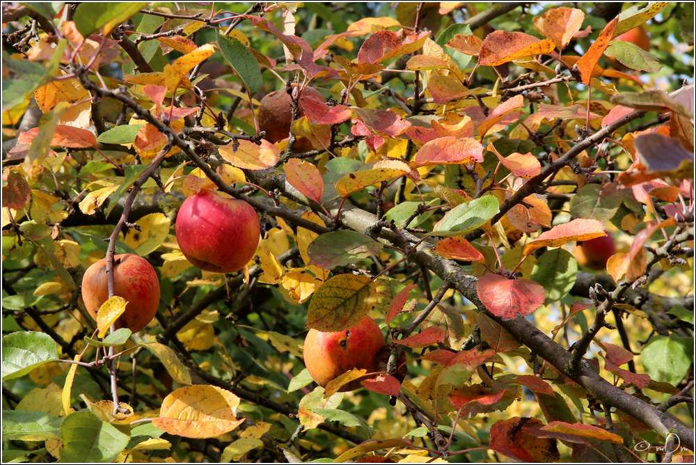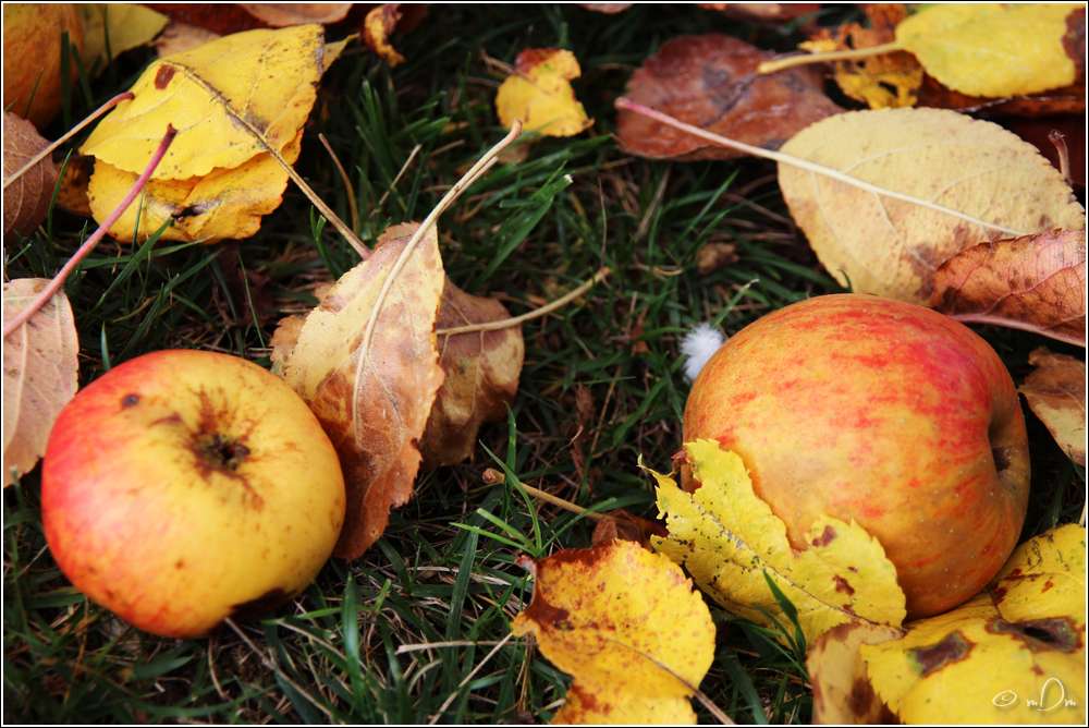 Sur le sol, au milieu des premières feuilles mortes, pommes et noix attendent d’être ramassées. Les dernières figues se dressent vers le ciel comme un signal pour les oiseaux qui viennent les manger...