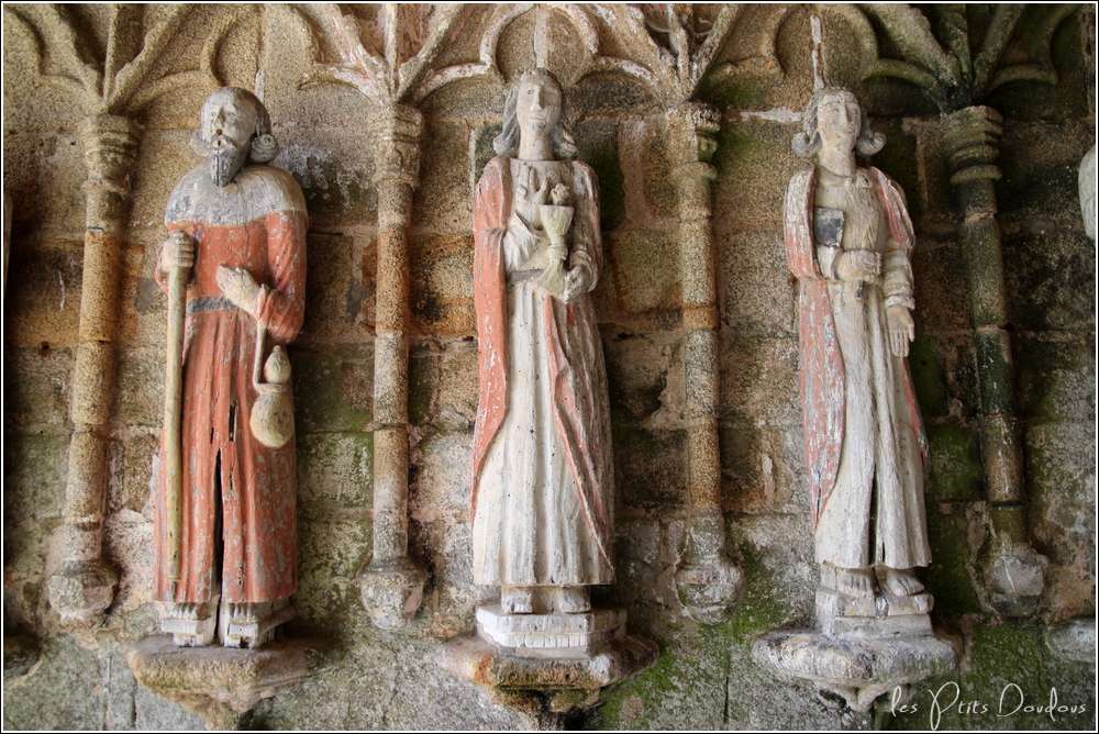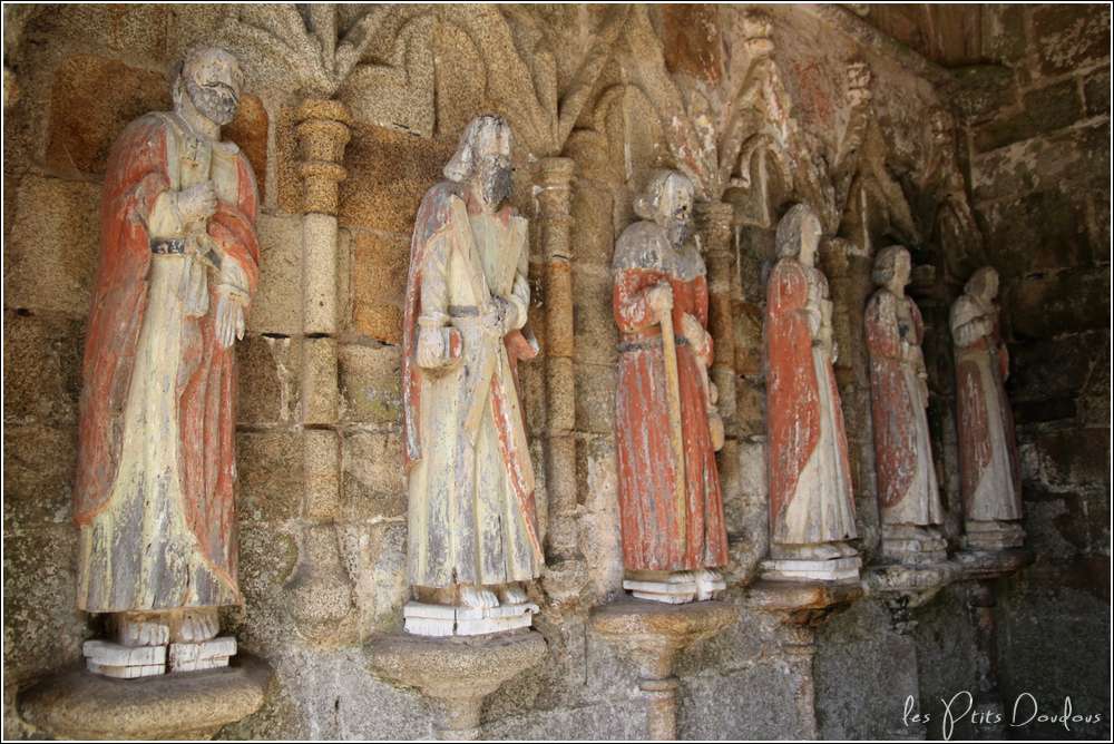 À l’intérieur du porche d’entrée, les parois abritent les statues en bois polychrome des douze apôtres.