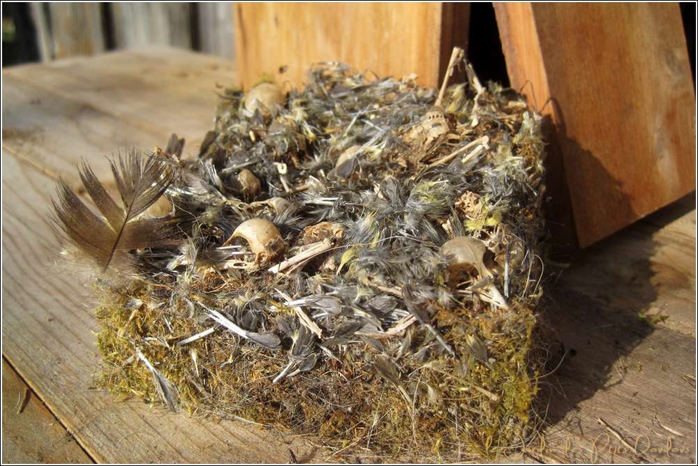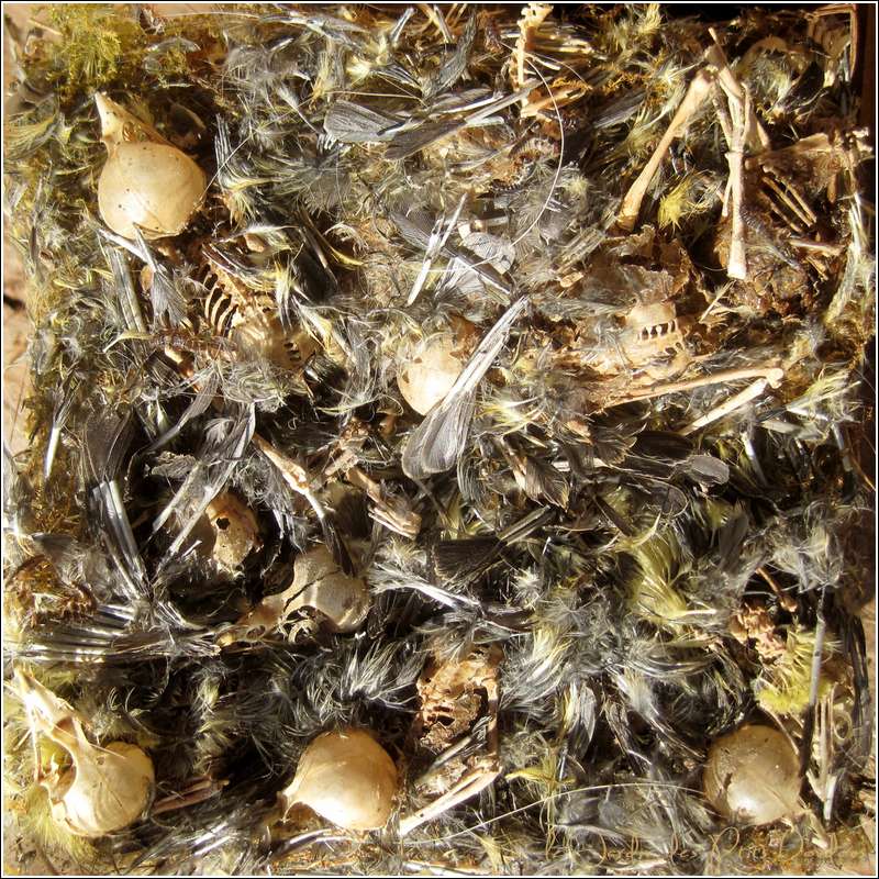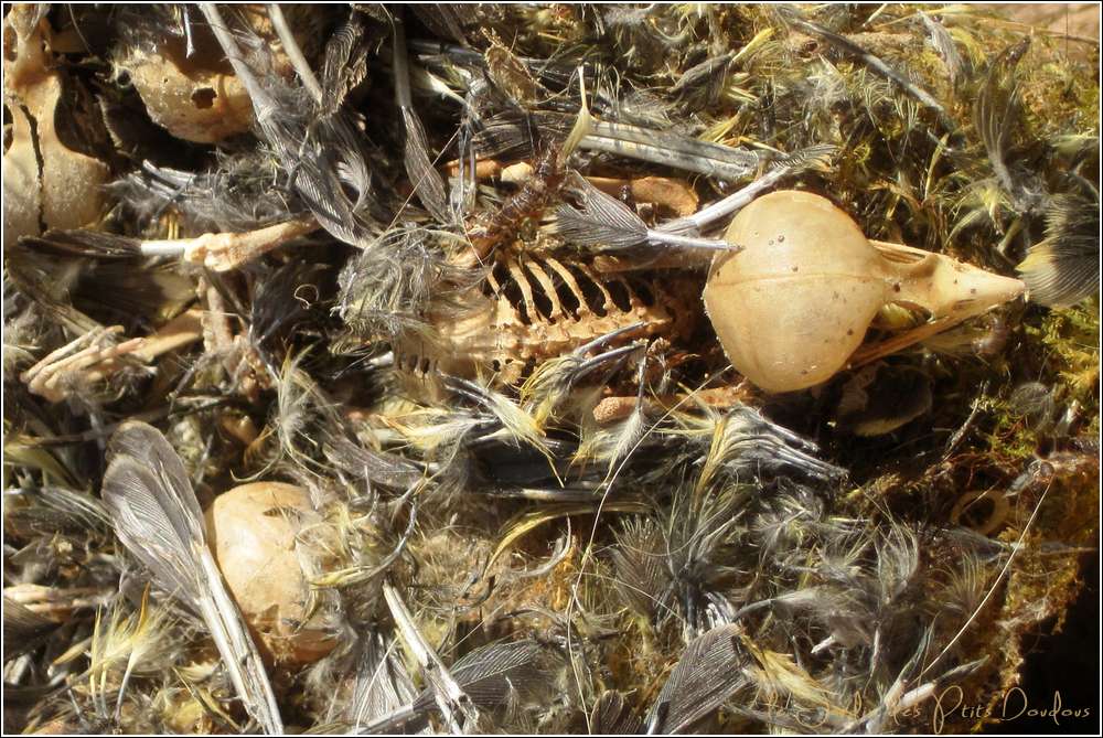 Mais en ouvrant le premier nichoir, macabre découverte : une couvée complète, pas moins de sept petits squelettes de jeunes mésanges... sans doute abandonnées dans leur nid, ou dont les parents ont fait le bonheur d’un chat du voisinage...
