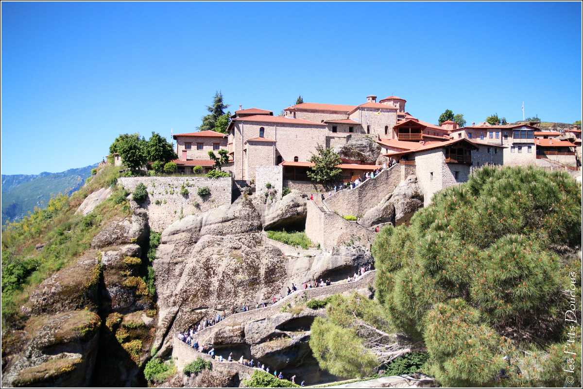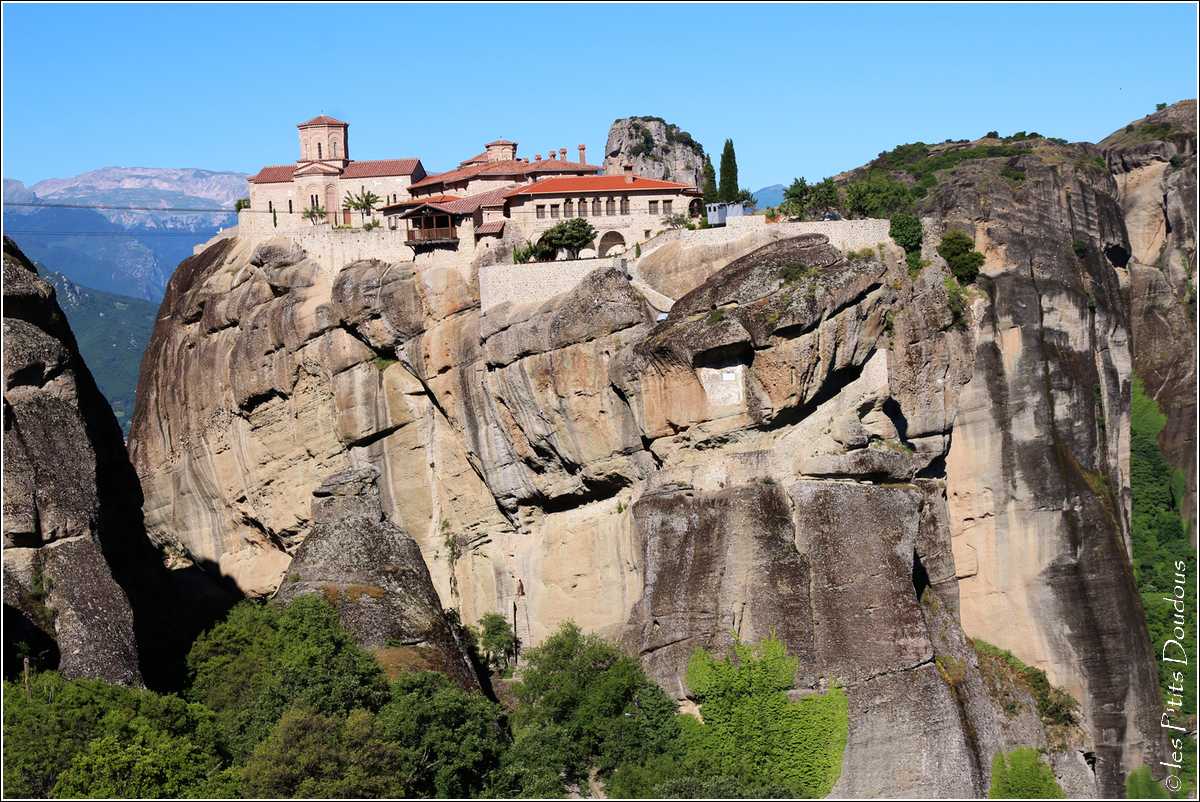 Sur la vingtaine de monastères orthodoxes, aux toits de tuiles rouges, qui ont remplacé les ermites, seuls six sont aujourd’hui habités. Des nacelles suspendues à des câbles, des escaliers à flanc de rocher ou des ponts ont remplacé les anciennes échelles et monte-charges rudimentaires, permettant maintenant d’y accéder plus facilement pour y admirer leurs trésors : fresques, icônes, croix et objets en or.