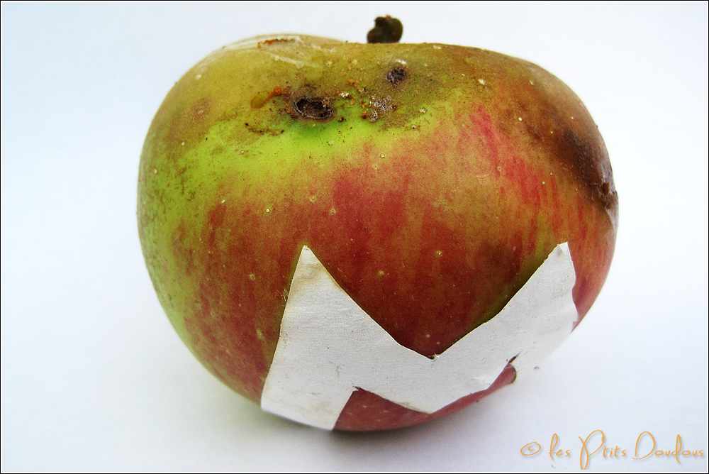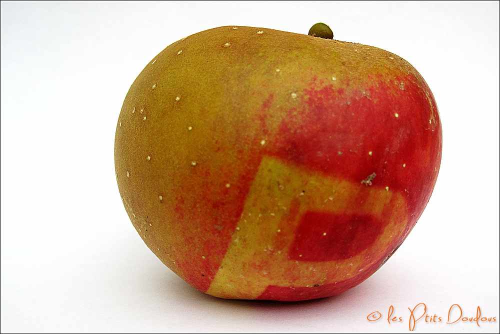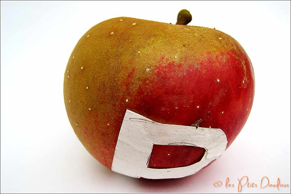 En reprenant l’idée des jardins anciens qui produisaient des fruits marqués (pommes, poires de Montreuil), des pochoirs découpés dans du papier ont été collés sur quelques pommes "Belle de Boskoop" avant leur maturité.