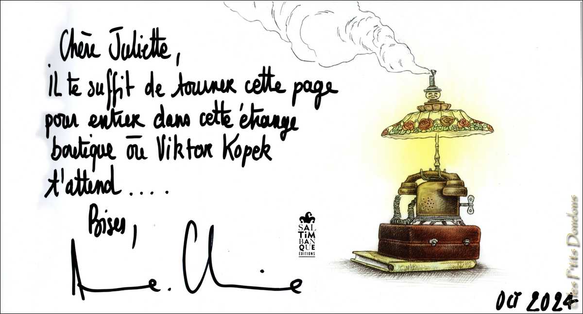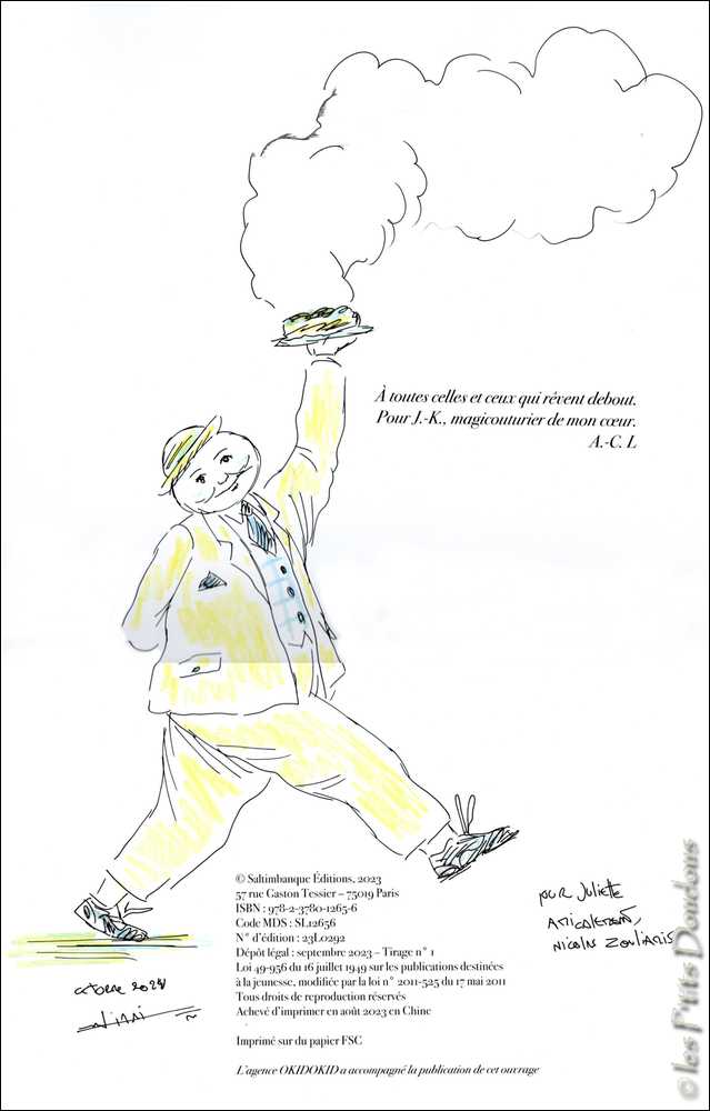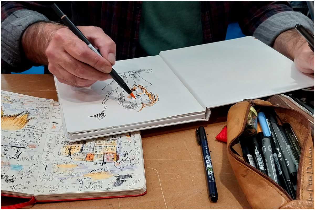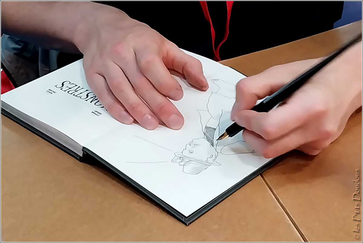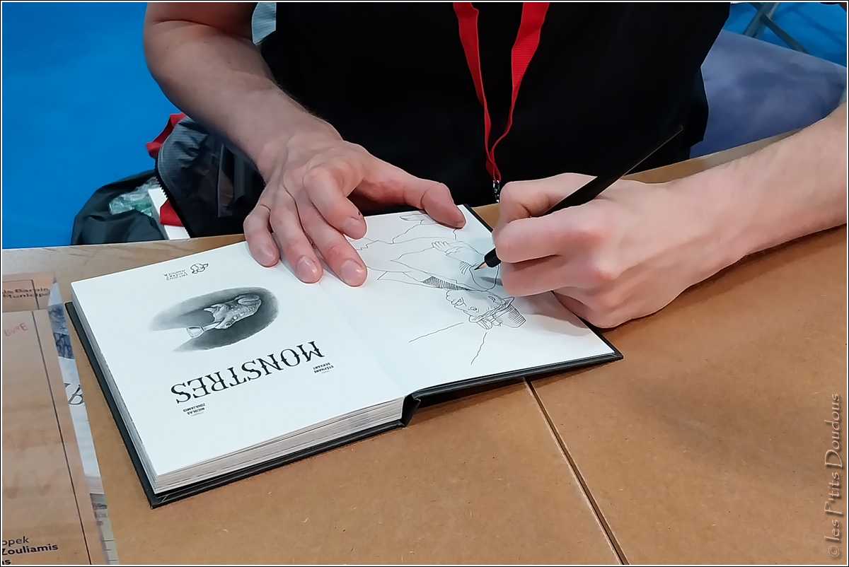 Les auteurs s’installent pour une longue soirée de dédicaces, pas ou peu de fille d’attente, ils sont alors disponibles et prennent leur temps pour vous faire une belle illustration rehaussée de couleurs tout en discutant avec vous.