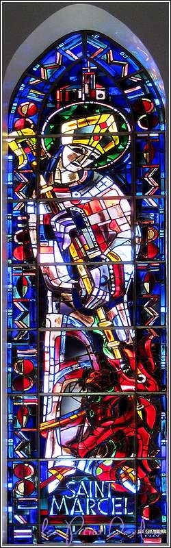 ChampagnePhotos"le" Saint Marcel est un vitrail, l’une des deux verrières, avec Sainte Geneviève, de 8 mètres, surmontées d’un panneau circulaire, conçues en 1935 pour l’une des douze baies hautes de la nef de la cathédrale Notre-Dame de Paris.