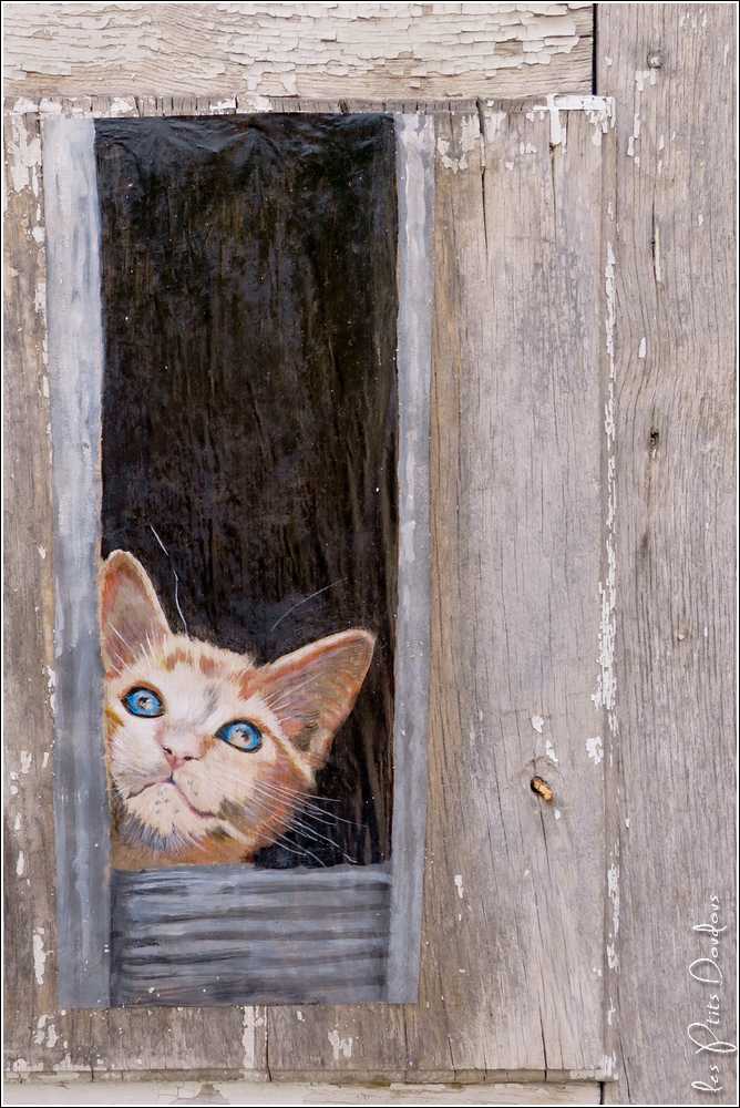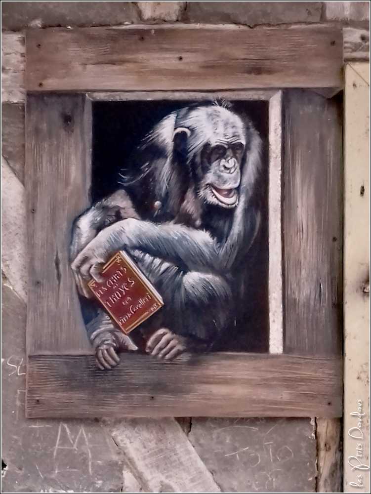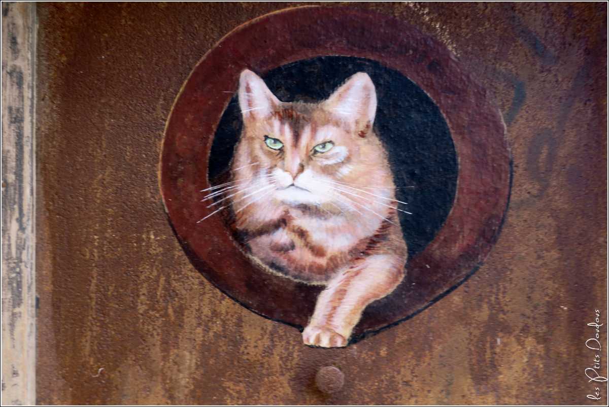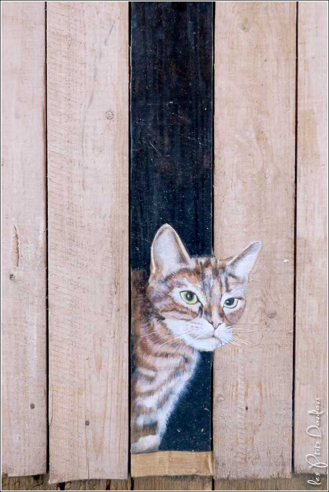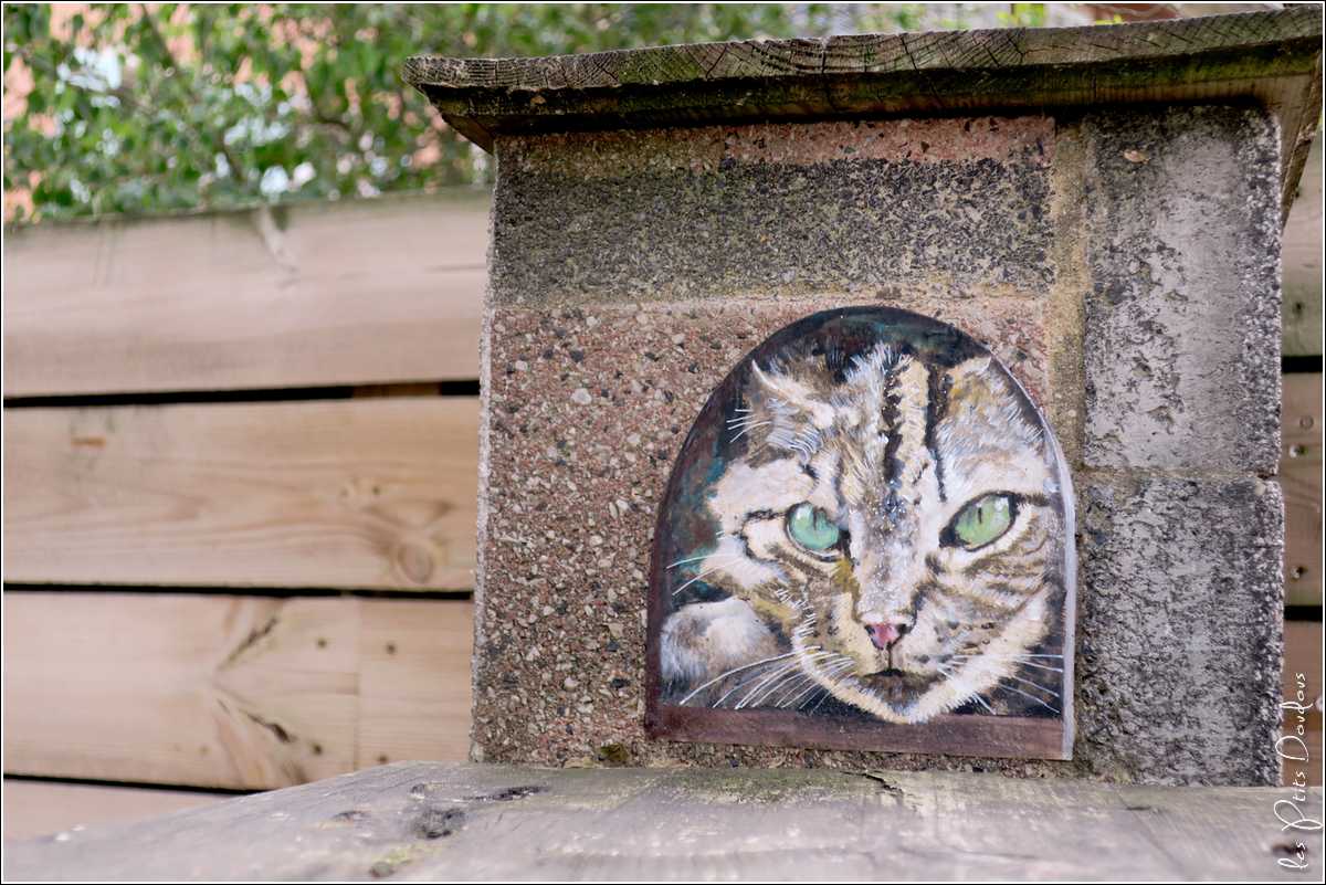 Parmi tous ces chats vous y verrez le portrait de leur auteur, ainsi que, ajout récent, un singe malicieux qui présente cette galerie en plein air.