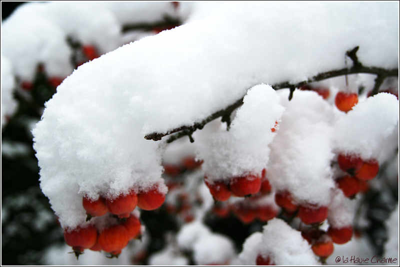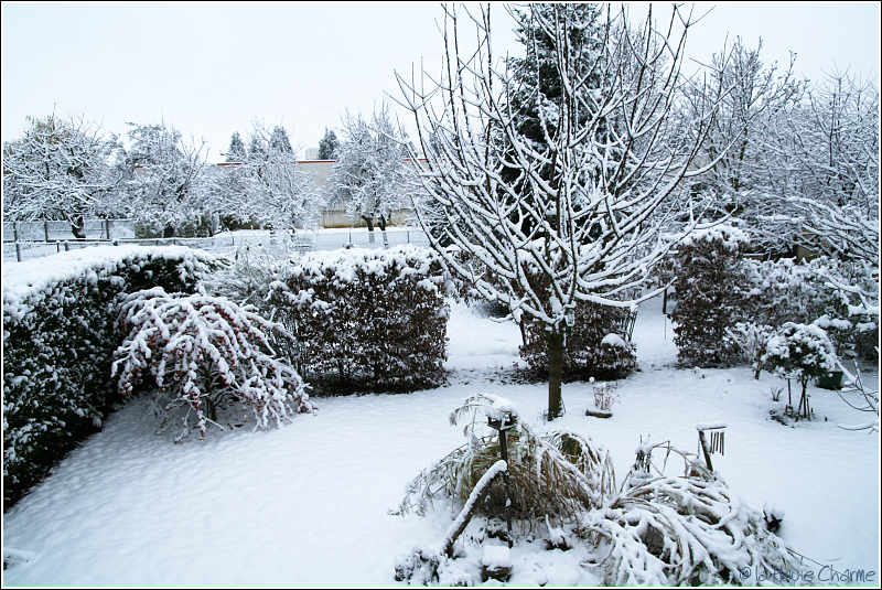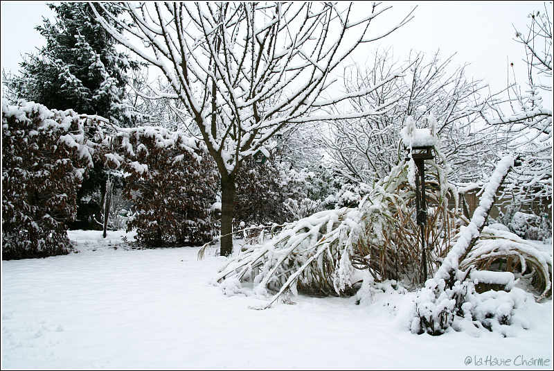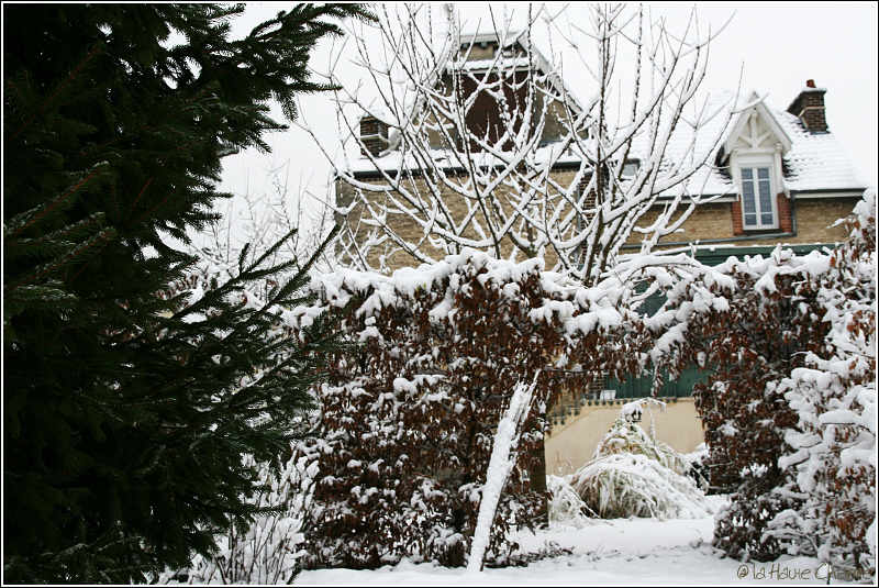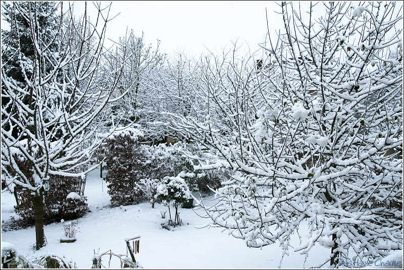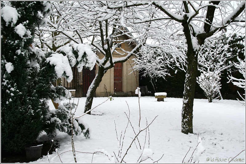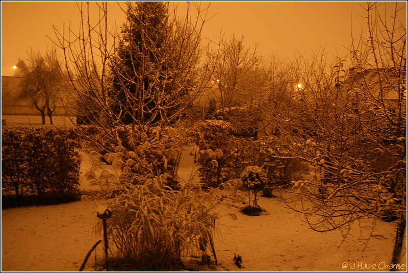 Après les verts de cet été et les chaudes couleurs de l’automne, le jardin a pris celles de l’hiver. Suivant les heures et le ciel : blanc laiteux, blanc bleuté, blanc gris,... jusqu’au blanc orangé (mais là ce n’est plus du naturel... ce sont les reflets des luminaires de la rue...)