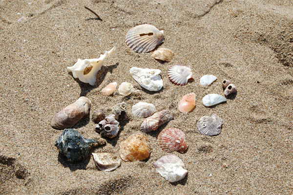 Des murex à la coquille fine comme de la dentelle, des strombes combattant aux couleurs jaune et rose, des pugilinas torsadés comme des escargots, de petites porcelaines chatoyantes,... et ses préférés des "monnaies caraïbes" [2] ... elle en ramassa autant qu’elle pu...