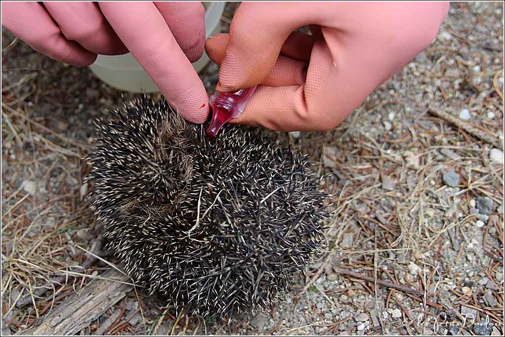Dernier arrivé, un jeune hérisson qui se promenait près de la balançoire des P’tits Doudous. Peu farouche, il fut facile d’attraper la boule de piquants... Surprise : plusieurs tiques sont accrochées entre les piquants du pauvre animal !